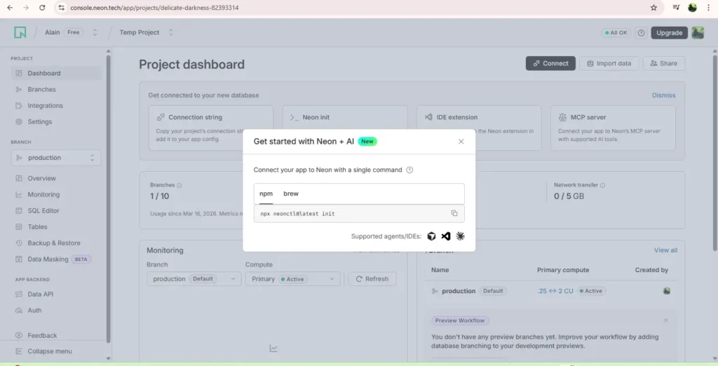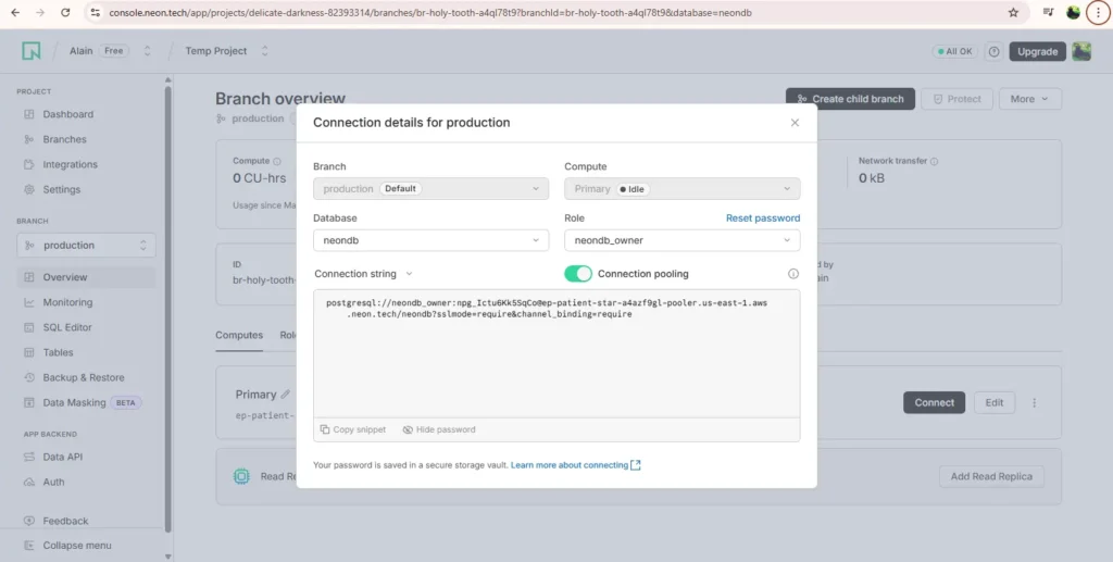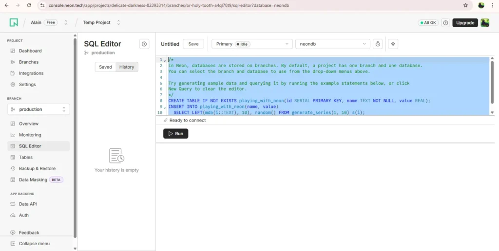 At this point a default database for owner ‘neonowner’ has been created namely “neondb”.